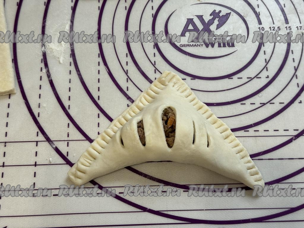 Углом теста с разрезами накрыть угол с печёночной начинкой, в результате получится треугольная заготовка слойки. Хорошо скрепить края слойки при помощи вилки. Если зубцы вилки будут сильно липнуть к тесту, тогда можно припорошить концы вилки мукой.