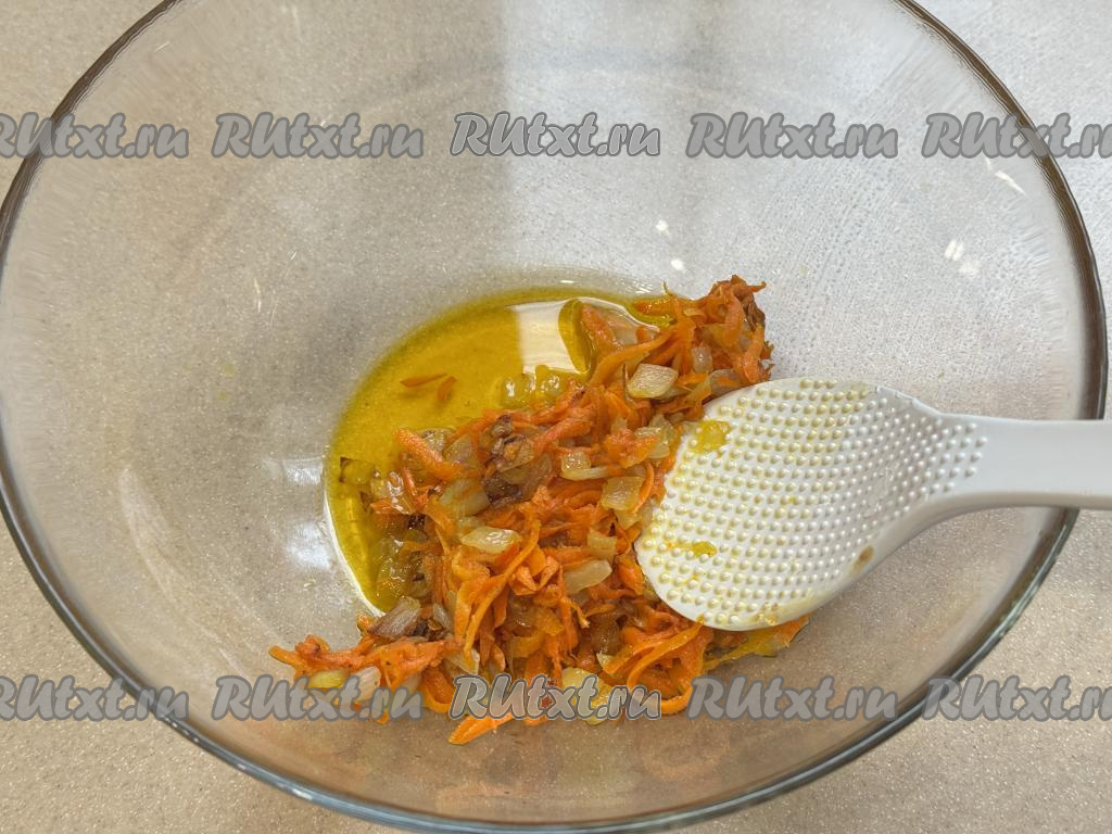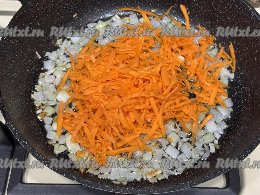 К луку, обжаренному до прозрачности, добавить натёртую на крупной тёрке морковку, перемешать.