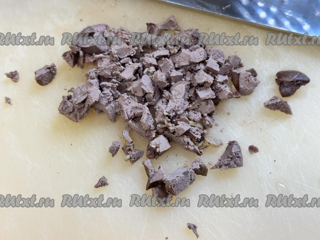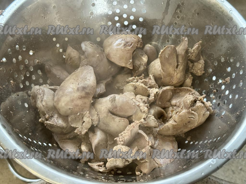 Откинуть сварившуюся печёнку на дуршлаг, дать стечь воде. Слегка остудить печень.
