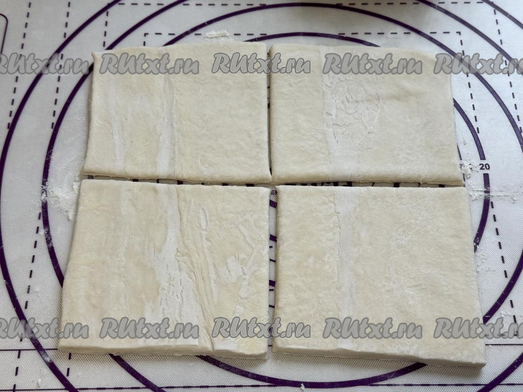У меня слоёное тесто было в квадратных пластах. На рабочей поверхности, присыпанной мукой, каждый пласт размороженного слоёного теста разрезать на 4 квадрата. В результате из двух пластов теста у мня получились 8 квадратов, именно столько слоек я и формировала.