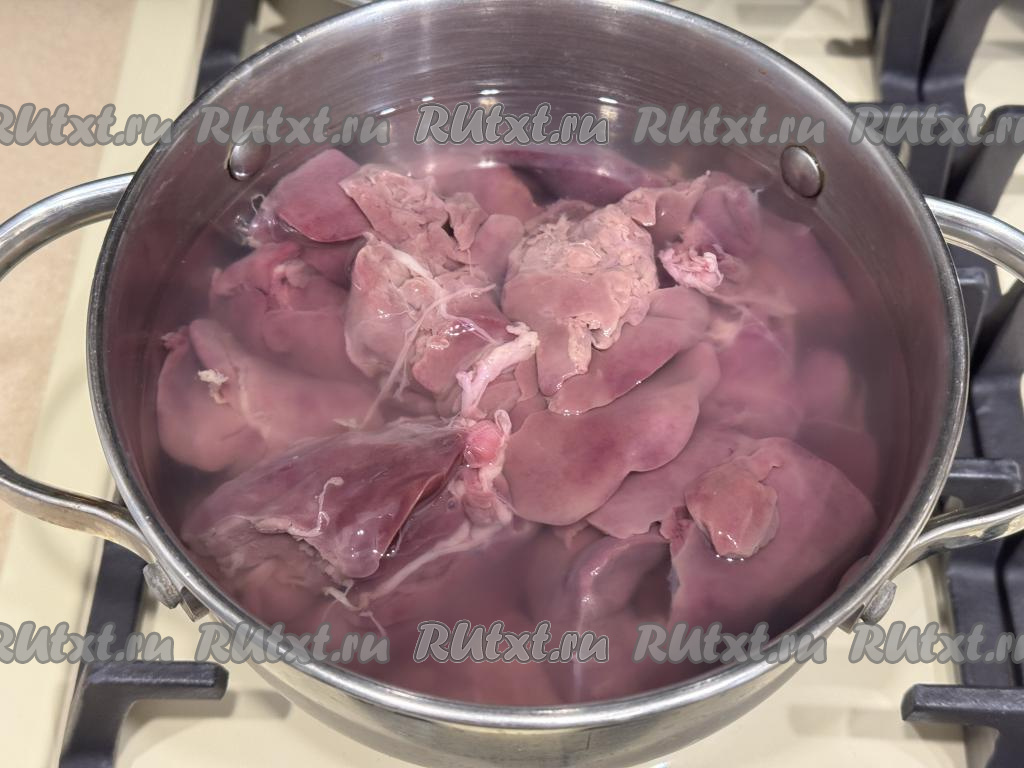 Дать воде закипеть, варить куриную печень с момента закипания 10 минут (свиную - 30-35 минут, говяжью - минут 40). После этого сделать на варёной печени надрез, если выделяется прозрачный сок без примесей крови, значит печёнка готова. Если же в разрезе есть примесь крови, значит нужно увеличить время варки минут на 5.