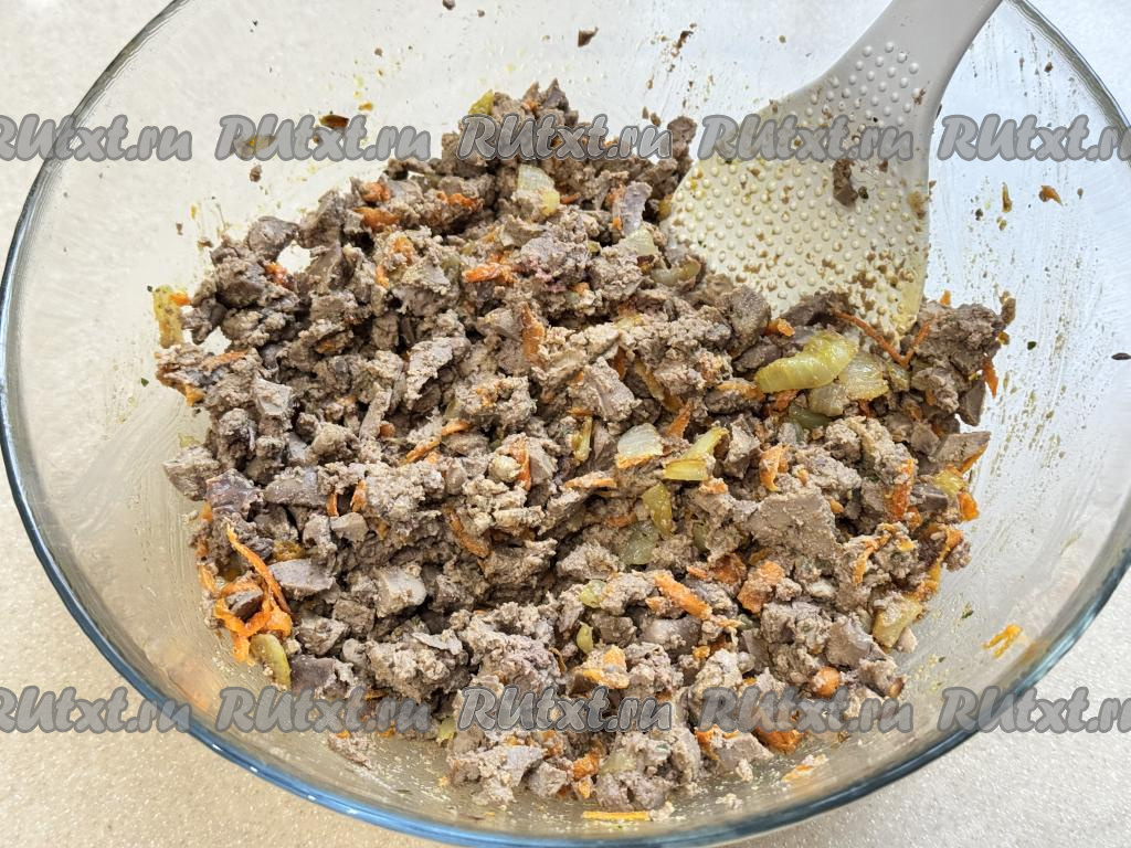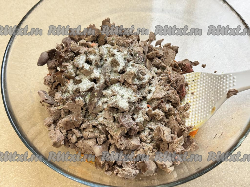 Нарезанную печень добавить в миску с обжаренными морковкой и луком, посолить по вкусу.