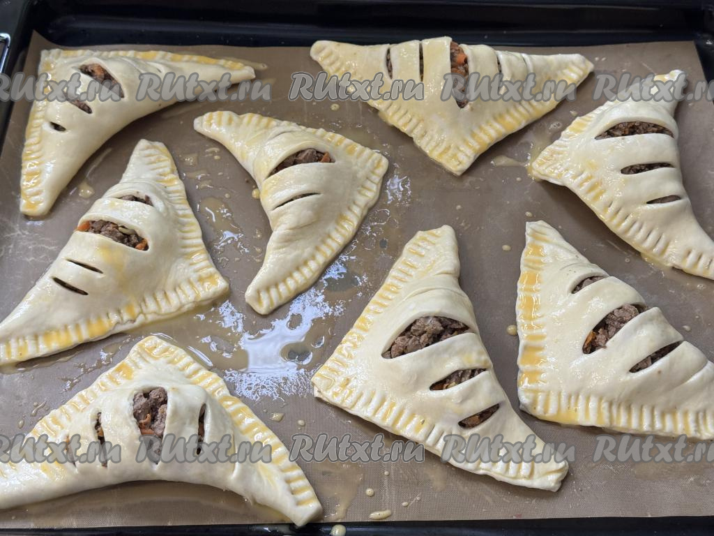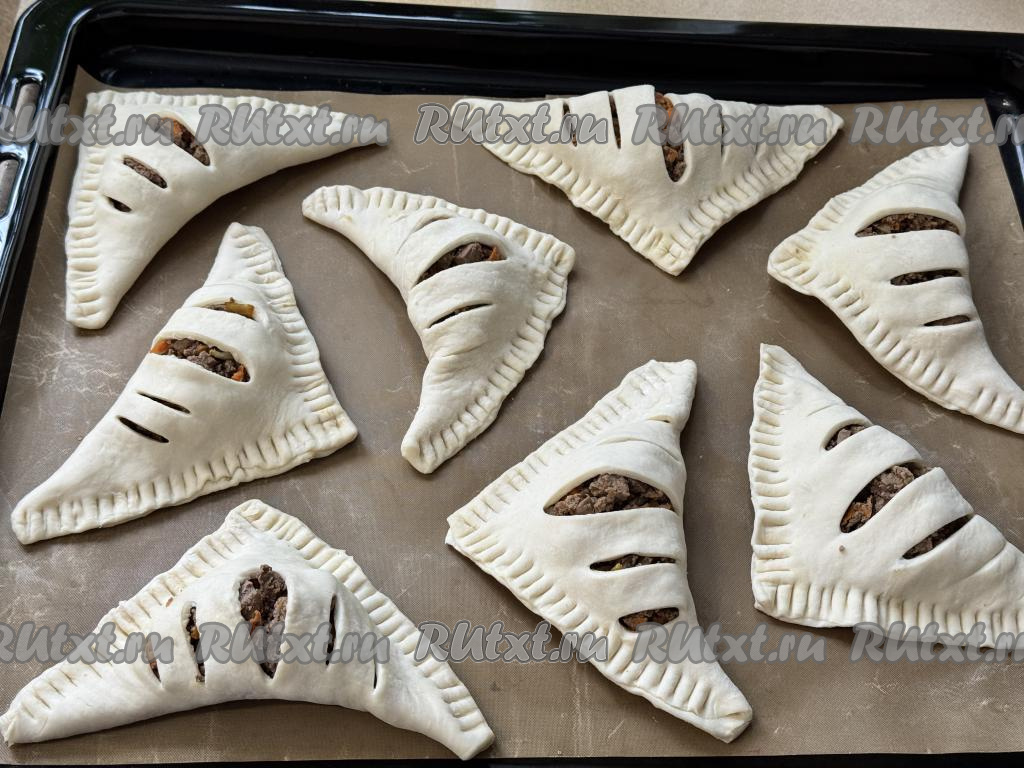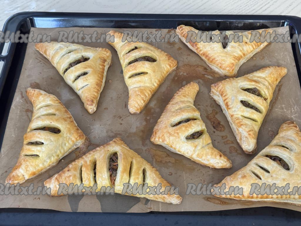 Слойки с печенью выпекать в разогретой до 200 градусов духовке минут 20 (до подрумянивания слоёного теста).