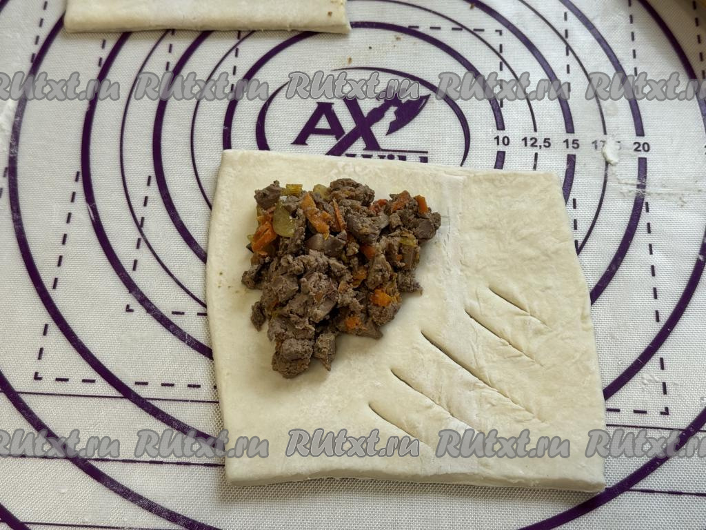 Я сразу разделила начинку на 8 частей - по количеству будущих слоек. Немного раскатать каждый квадратик теста. У меня получились квадраты со стороной 15 сантиметров. Ближе к одному краю квадрата, отступив от краёв по 1 сантиметру, выложить одну часть начинки из печёнки и овощей. На краю квадрата, который противоположен углу квадрата с начинкой, сделать несколько разрезов, как на фото.