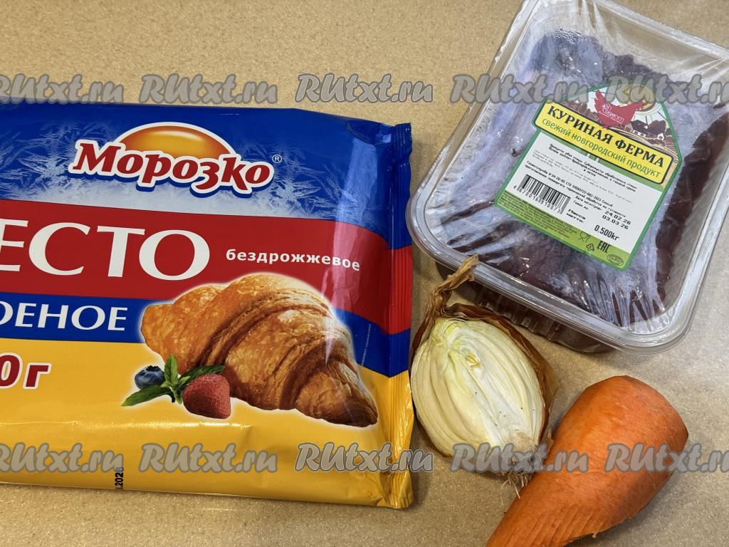 Подготовить продукты. Слоёное тесто можно взять как дрожжевое, так и бездрожжевое (я купила бездрожжевое слоёное тесто). Печёнку можно взять любую (у меня - куриная, но подойдёт и, например, свиная или говяжья). Лук и морковь очистить. Достать из морозилки слоёное тесто и разморозить его при комнатной температуре.