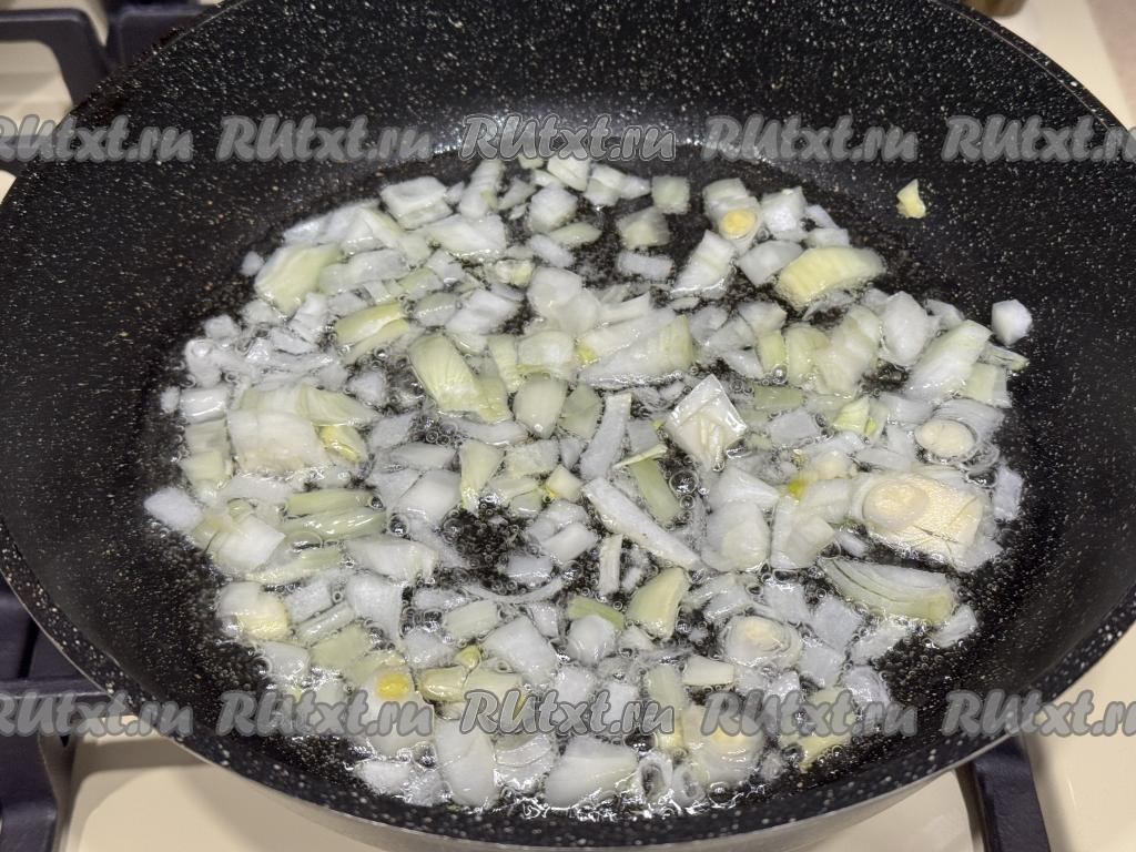 В сковороду влить растительное масло, разогреть, выложить мелко нарезанную луковицу. Обжарить лук на среднем огне до прозрачности (примерно в течение 3-4 минут), не забывая время от времени перемешивать.