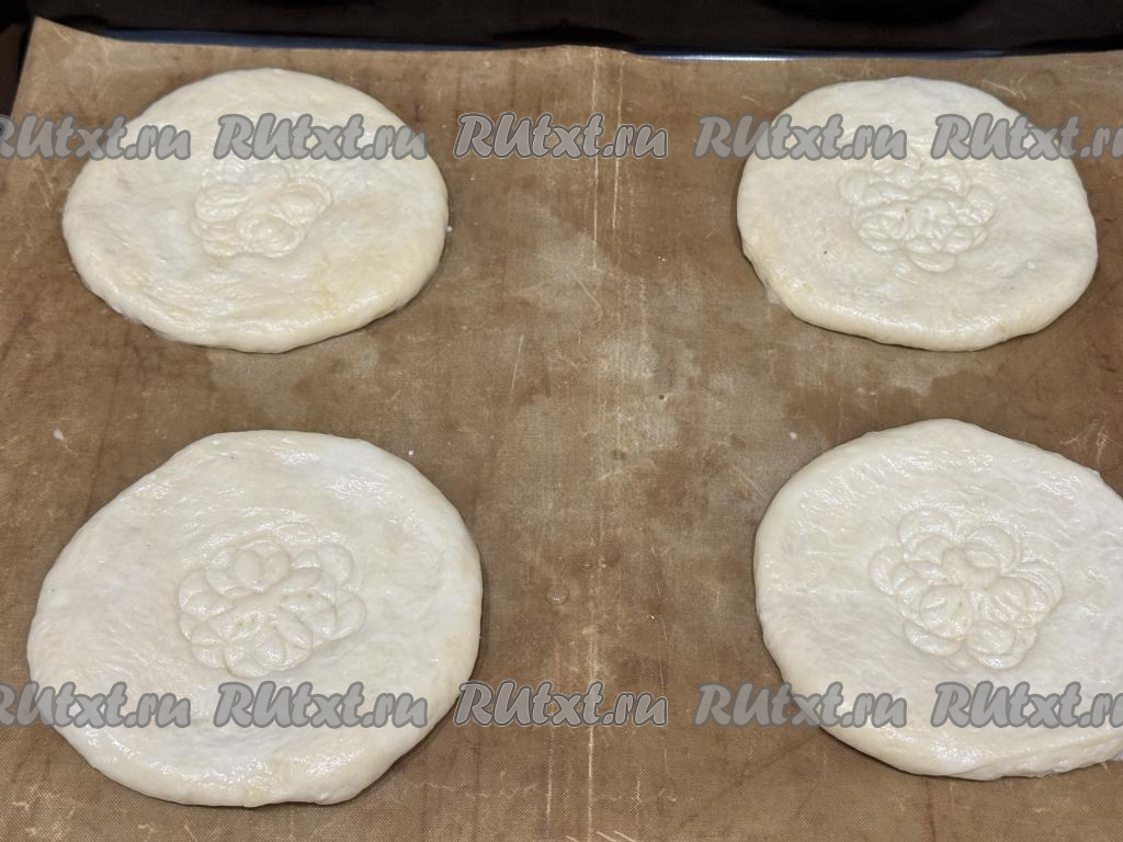 Растянуть каждую часть теста руками в круг толщиной примерно 0,5 сантиметра. В результате у меня получились 4 лепёшки диаметром 13 сантиметров. Выложить получившиеся лепёшки на противень, застеленный ковриком (или пергаментом) для выпечки. Серединку каждой лепёшки наколоть вилкой или прижать трафаретом для выпечки (я использовала трафарет в виде цветка).