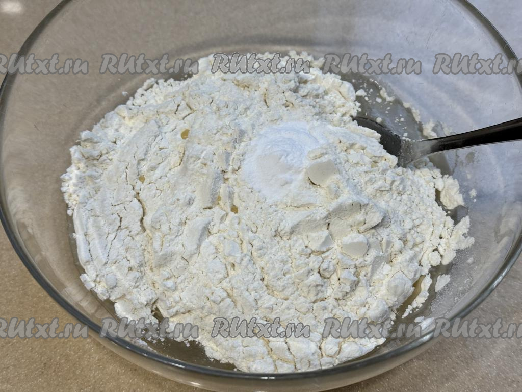 В получившуюся смесь всыпать соду, перемешать венчиком. Предварительно соду гасить не нужно, она погасится в смеси рассола и уксуса. Всыпать 150 грамм муки, перемешать столовой ложкой до однородности.