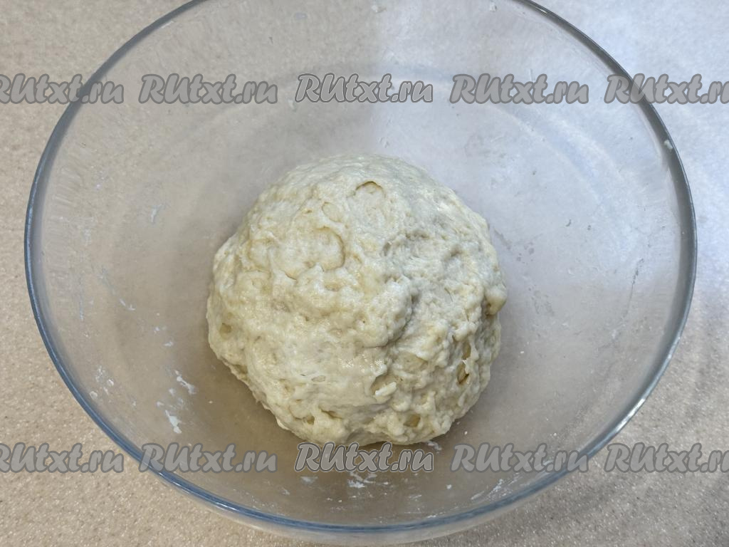 Миску с тестом прикрыть полотенцем и оставить на кухонном столе "отдохнуть" на 15-20 минут. Затем переложить тесто на рабочую поверхность, слегка присыпанную мукой, и обмять.