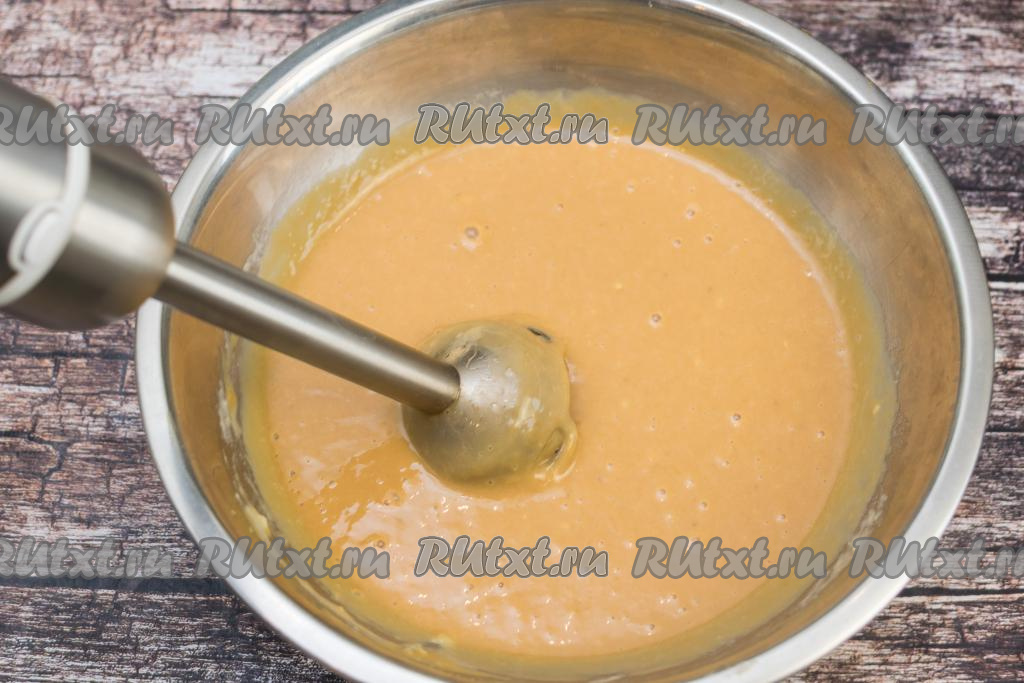 Можно смешать бананы и сгущёнку лопаткой. Но, чтобы крем для вафельного торта был более однородным, я пробила бананы и варёную сгущёнку погружным блендером. Крем для промазывания вафельных коржей получился нежным, однородным и очень вкусным.