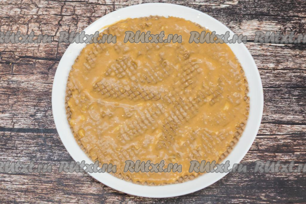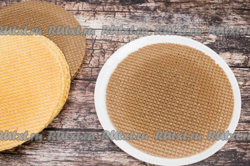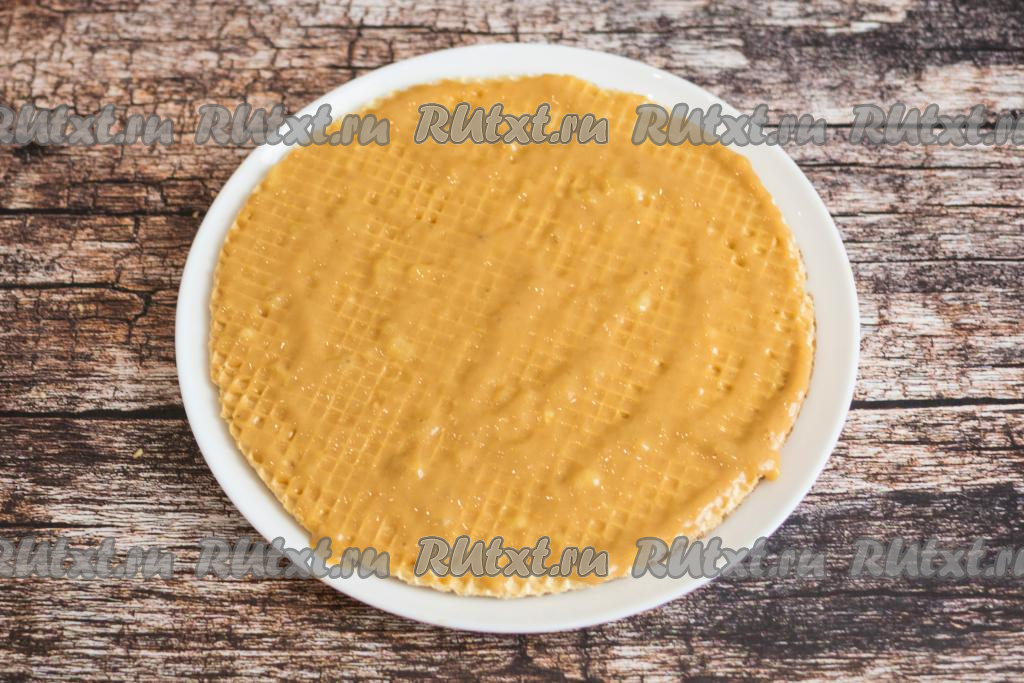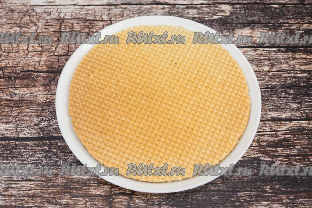 На плоскую тарелку или доску выложить первый вафельный корж.