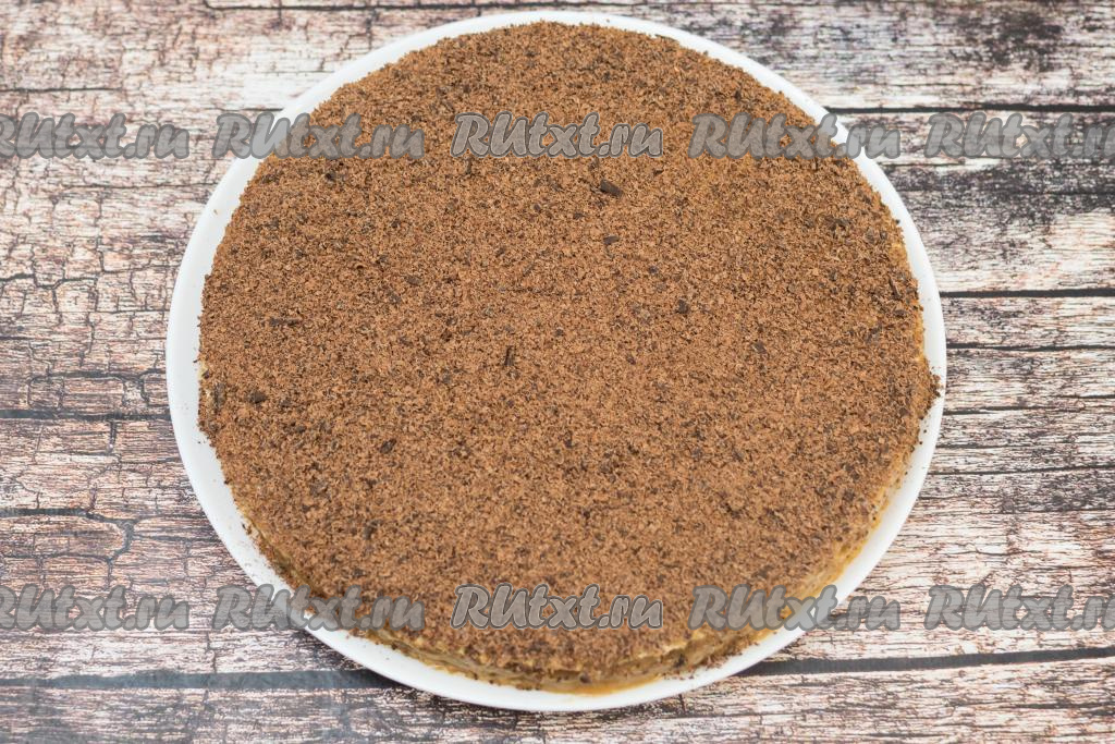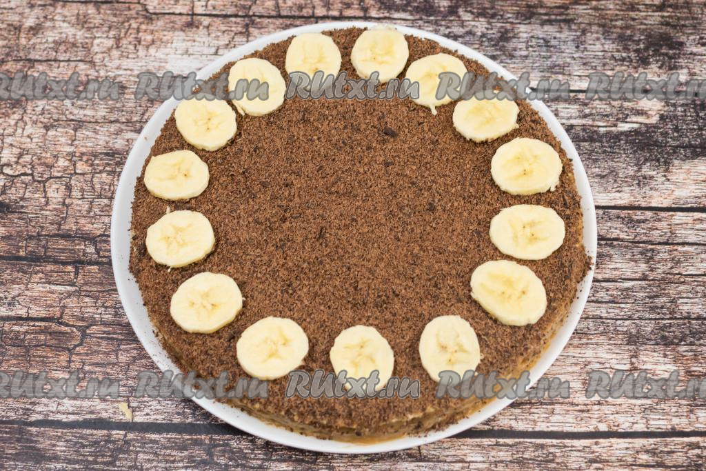 По прошествии, как минимум, 2 часов тортик хорошо пропитается кремом. Остаётся его только украсить перед подачей. Для этого нужно натереть на мелкой тёрке охлаждённый шоколад и присыпать им верх торта.