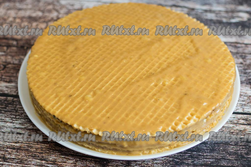 У меня вафельные коржи были двух цветов, поэтому, для того чтобы торт более красиво смотрелся в разрезе, я коржи выкладывала поочерёдно. Перед формированием торта осмотрите все коржи, если есть повреждённые, тогда их используйте в середине торта, а нижним и верхним - должны быть коржи без повреждений.