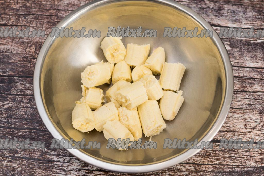 Очистить бананы, поломать руками на кусочки и сложить в глубокую миску.
