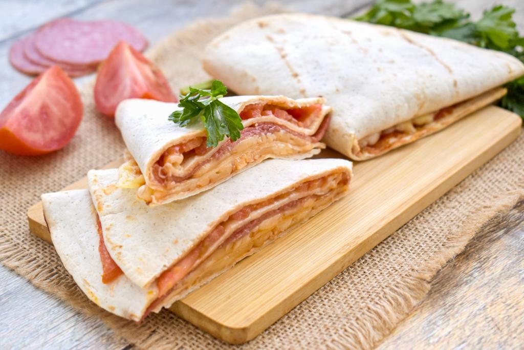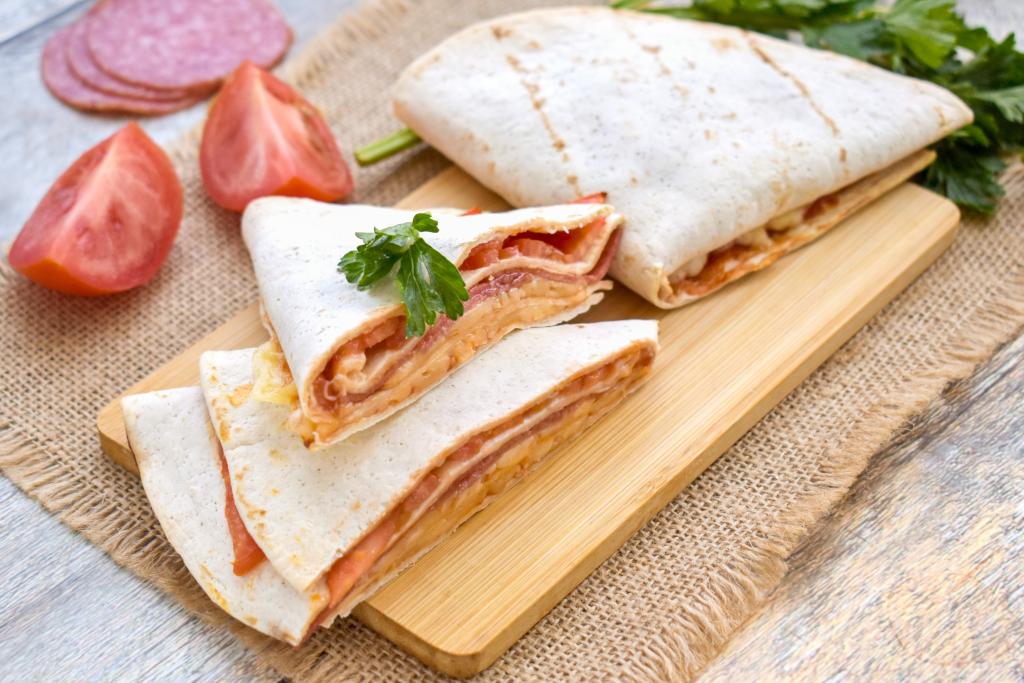 Повторяем сворачивание, в результате получается заготовка из лепёшки "Тортилья" с начинкой из колбасы и сыра в виде треугольника. Аналогично формируем второй треугольник из тортильи и оставшихся помидоров, колбасы и сыра.