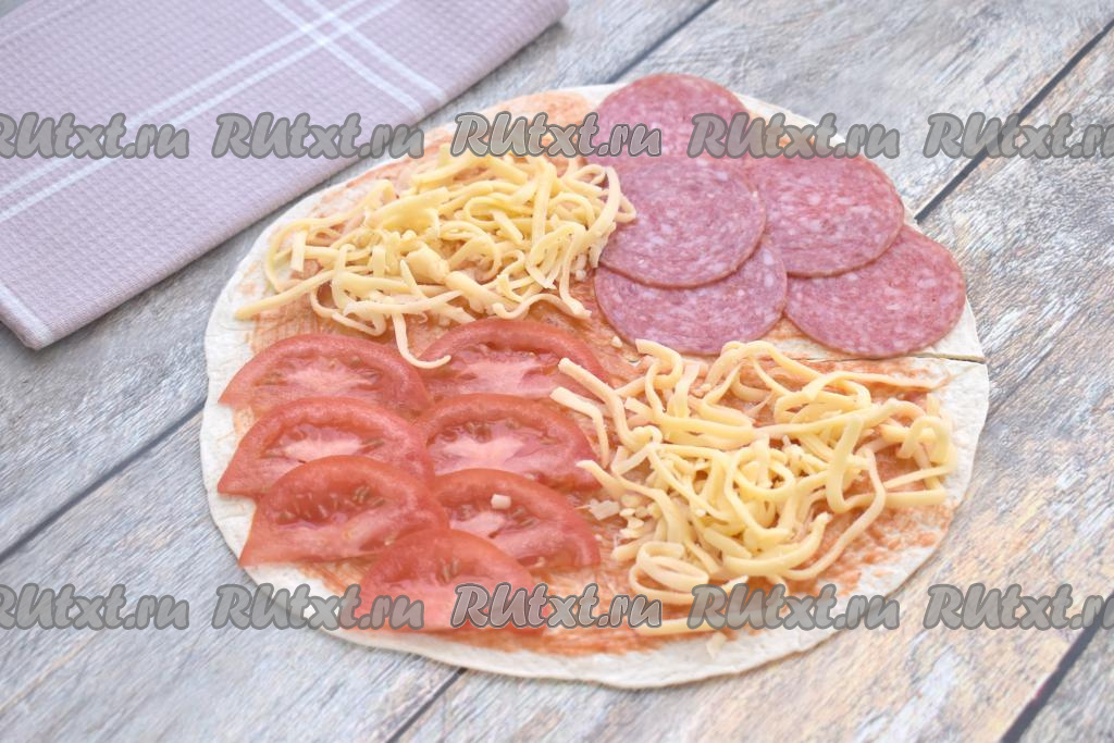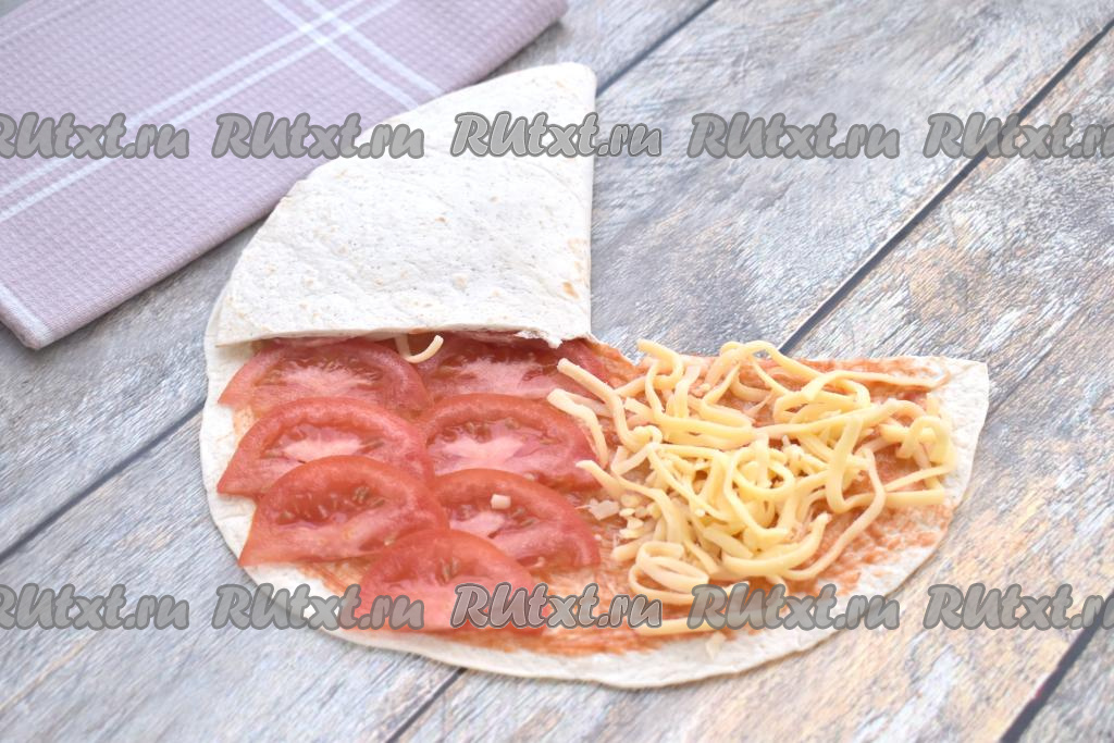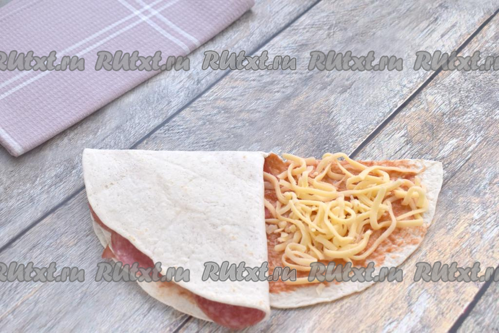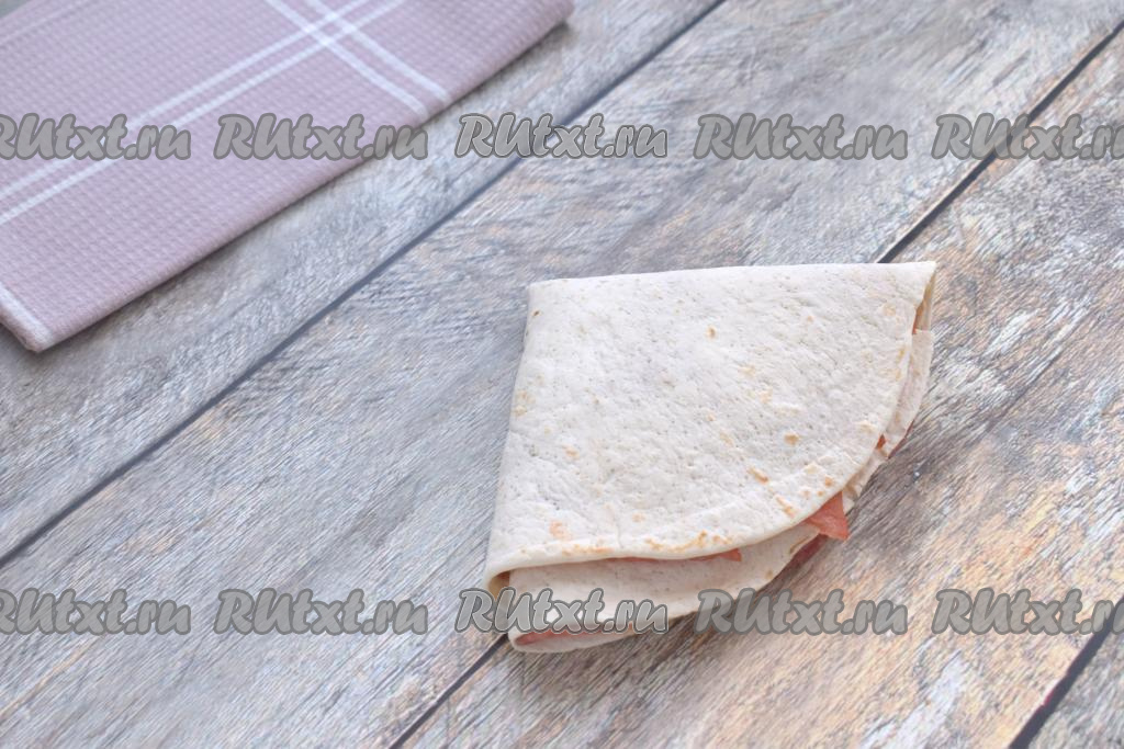 Берёмся за часть лепёшки, на которой расположена колбаса, и аккуратно накрываем ею часть с сыром.