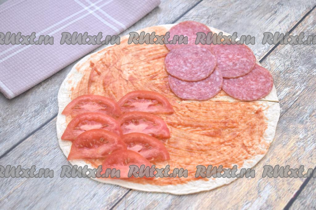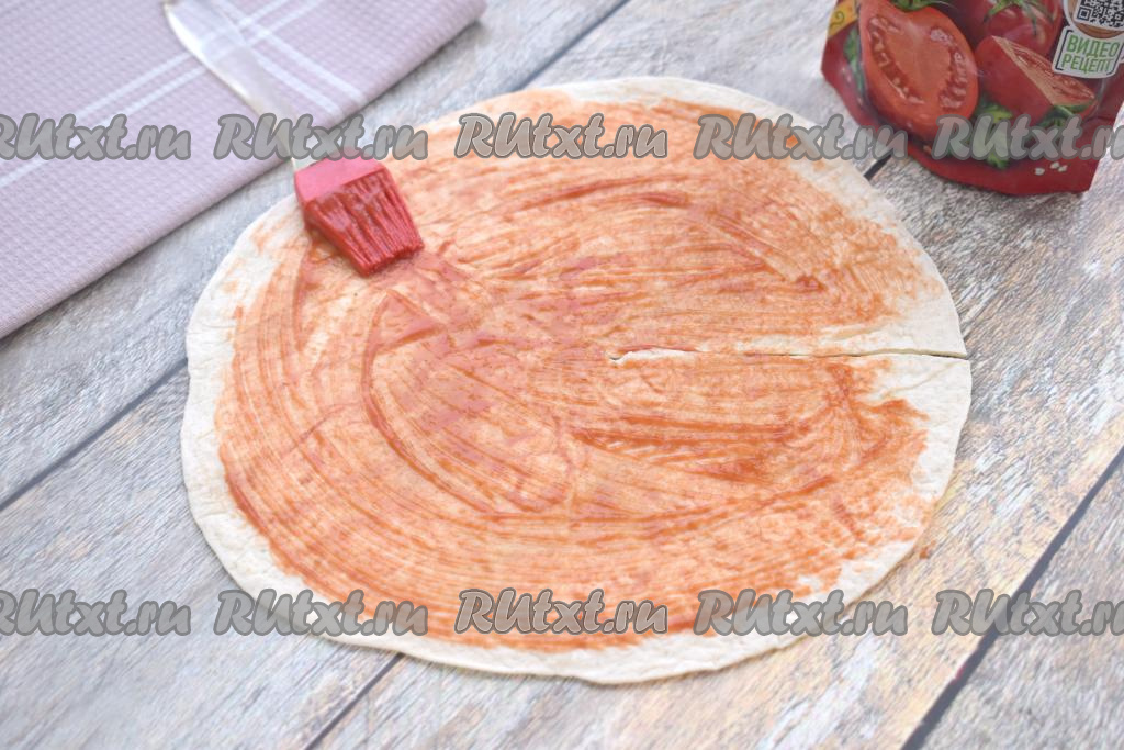 В результате у нас получится круглая заготовка из тортильи с разрезом, как на фото. С помощью кулинарной кисточки смазываем лепёшку 1 столовой ложкой кетчупа (или томатного соуса), немного отступая от краёв лепёшки.