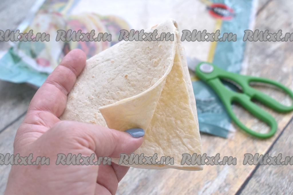 Лепёшки "Тортилья" продаются практически в любом продуктовом магазине. В этот раз я купила тортильи диаметром 25 сантиметров. Вначале одну лепёшку складываем пополам, затем ещё раз складываем пополам. Благодаря предварительному сгибанию, в дальнейшем лепёшку с начинкой будет проще сгибать перед запеканием в аэрогриле. Один сгиб лепёшки разрезаем кулинарными ножницами до центра.