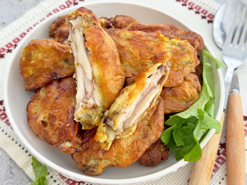А вот как крылышки, запечённые в кляре в аэрогриле, выглядят в разрезе. Крылья, благодаря кляру, получаются румяными, аппетитными снаружи и сочными, нежными внутри. К столу их подаём горячими, дополнив гарниром, любимым соусом.