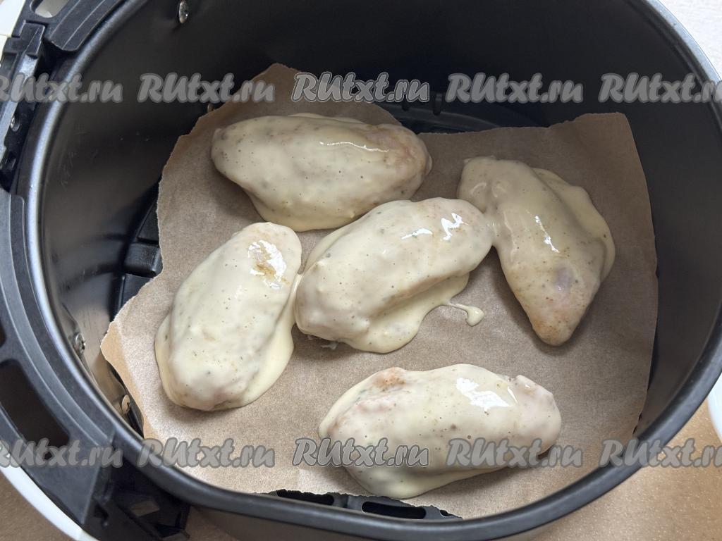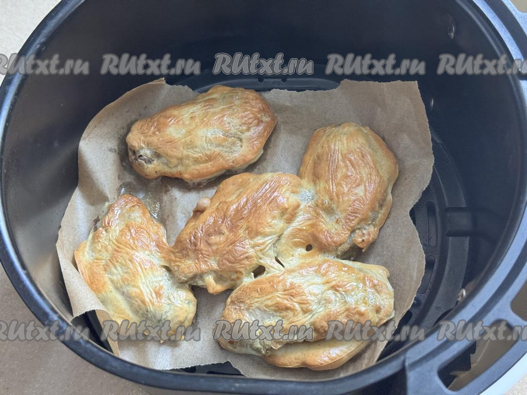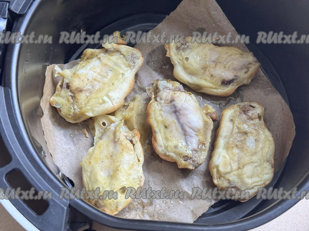 Чашу аэрогриля застелить пергаментом. Окунать крылья со всех сторон в кляр и сразу выкладывать в застеленную чашу аэрогриля.