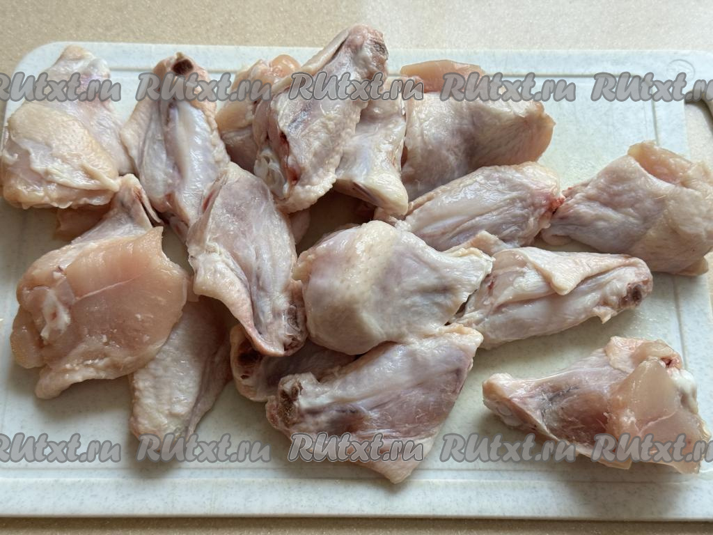 Подготовить продукты. Крылышки промыть водой, немного обсушить. Каждое крыло разрезать по фалангам на 3 части. Крайнюю (тонкую) часть крыла я не стала использовать, так как в ней нет мяса.