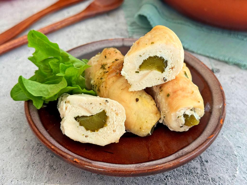 Сочные, нежные куриные рулетики с солёным огурцом подать к столу горячими, дополнив свежими овощами или любимым гарниром.
