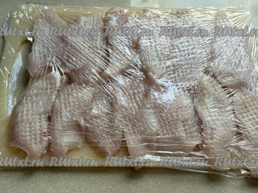 Накрыть кусочки мяса курицы пищевой плёнкой и отбить достаточно тонко с двух сторон кулинарным молоточком.