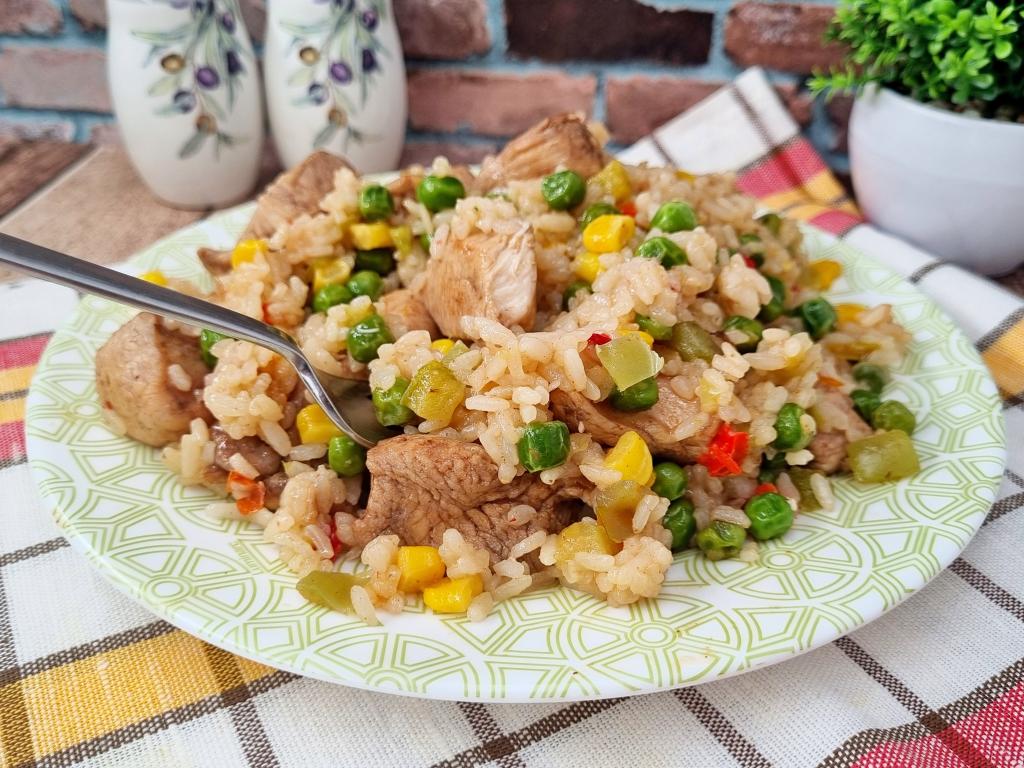 Многим из нас знакомы ситуации, когда нужно быстро, не тратя много времени на кухне, приготовить вкусный обед или ужин. Меня в этом случае выручают различные замороженные овощи и мясо курицы. В этот раз решила пожарить на сковороде покупную замороженную гавайскую смесь с кусочками филе куриной грудки. Блюдо готовится и быстро, и просто, а получается аппетитным, насыщенным и очень вкусным. Благодаря тому, что мясо курицы покрывается соевым соусом и жарится на достаточно сильном огне, филе становится нежным, не пересушенным. А рис и овощи, входящие в состав гавайской смеси, служат замечательным гарниром к куриному мясу. Для меня этот рецепт палочка-выручалочка, ведь, не тратя много времени, можно подать к столу полноценный обед или ужин, который с удовольствием ест вся семья!