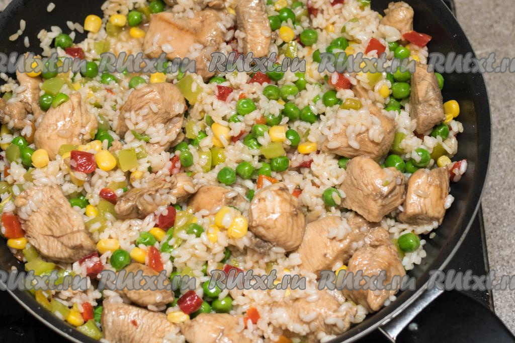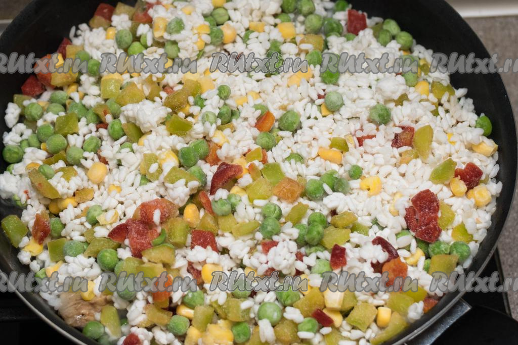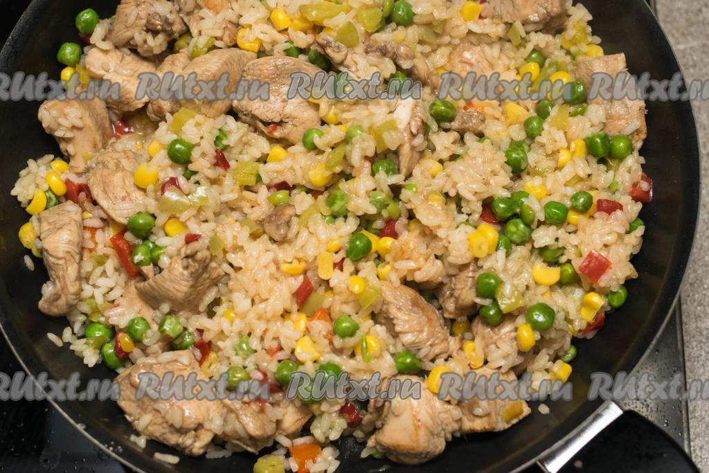Если рис у вас начинает приставать ко дну сковороды, тогда можно влить ещё немного воды или растительного масла.