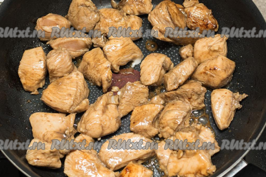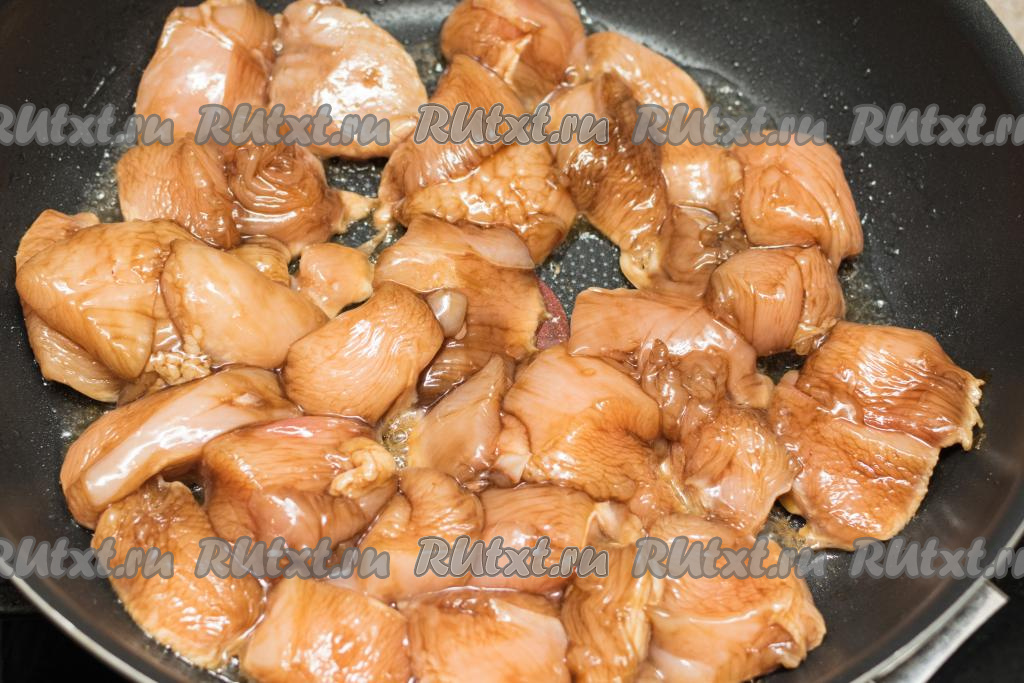 Сковороду хорошо разогреть с растительным маслом, выложить кусочки мяса курицы и обжарить на достаточно сильном огне в течение 4-5 минут (до подрумянивания филе со всех сторон).