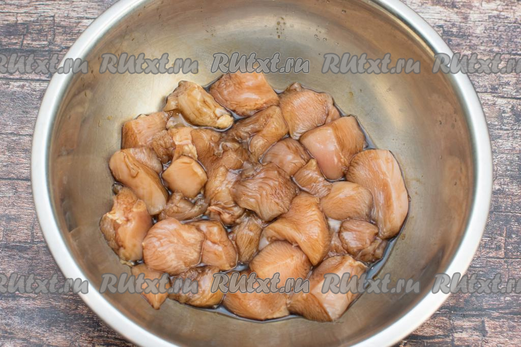Выложить кусочки куриного мяса в миску, залить соевым соусом. Тщательно перемешать, покрывая филе соусом со всех сторон. Оставить мясо на 5 минут пропитаться соевым соусом при комнатной температуре, после этого ещё раз перемешать. Соус весь впитается в куриное филе. Дополнительно я мясо не солю, потому что соевый соус достаточно солёный.