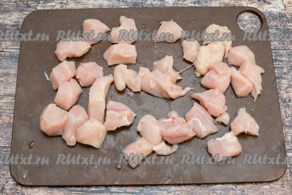 Куриное филе нарезать на средние кусочки.