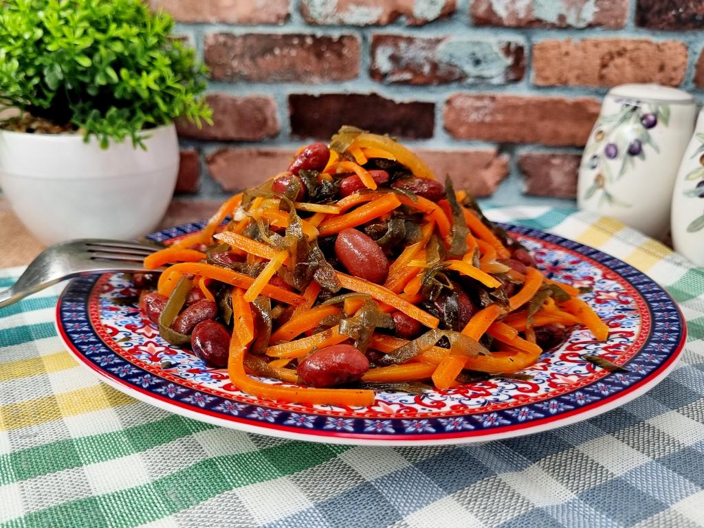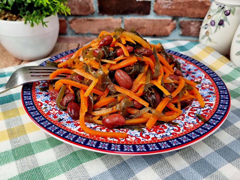 Если вы хотите разнообразить повседневное меню, тогда предлагаю приготовить насыщенный, нежный, аппетитный салат с морской капустой, консервированной фасолью и жареной морковью. В этом постном блюде отлично сочетаются все ингредиенты, создавая гармоничный вкус. Морская капуста придаёт салату небольшую пикантность, фасоль делает его более сытным, морковка дарит яркость и приятную сладость. Этот салат можно подать в качестве дополнения к различным блюдам в Пост, но и в остальные дни эта аппетитная закуска отлично впишется в ваше меню!
