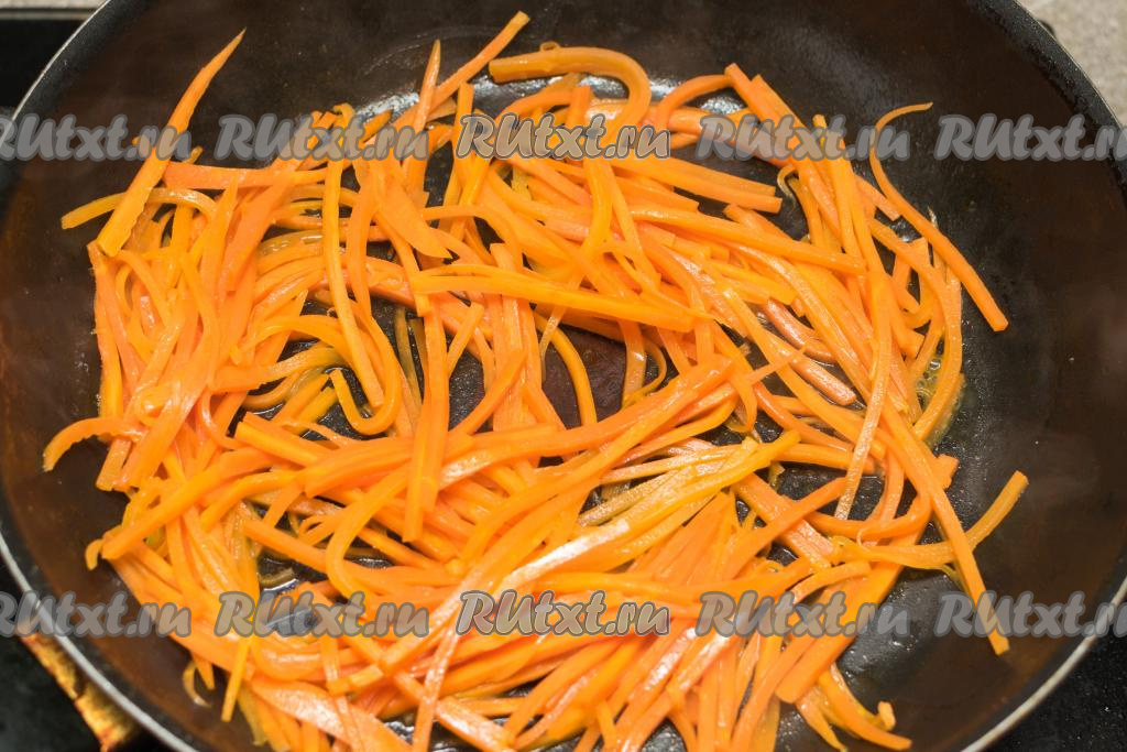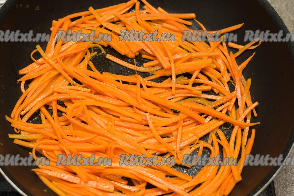 Обжарить морковку до мягкости (в течение 8-10 минут) на среднем огне, периодически перемешивая. Жареная морковь должна стать достаточно мягкой, но при этом хорошо держать форму. Я обычно жарю морковь на минимальном количестве растительного масла, поэтому в процессе обжаривания добавляю буквально 1-2 столовых ложки воды, а в конце жарки увеличиваю огонь, чтобы вода испарилась. Сковороду с жареной морковью убрать с огня, дать остыть.