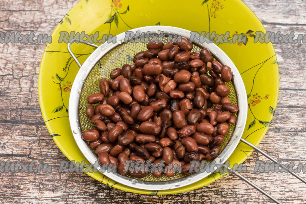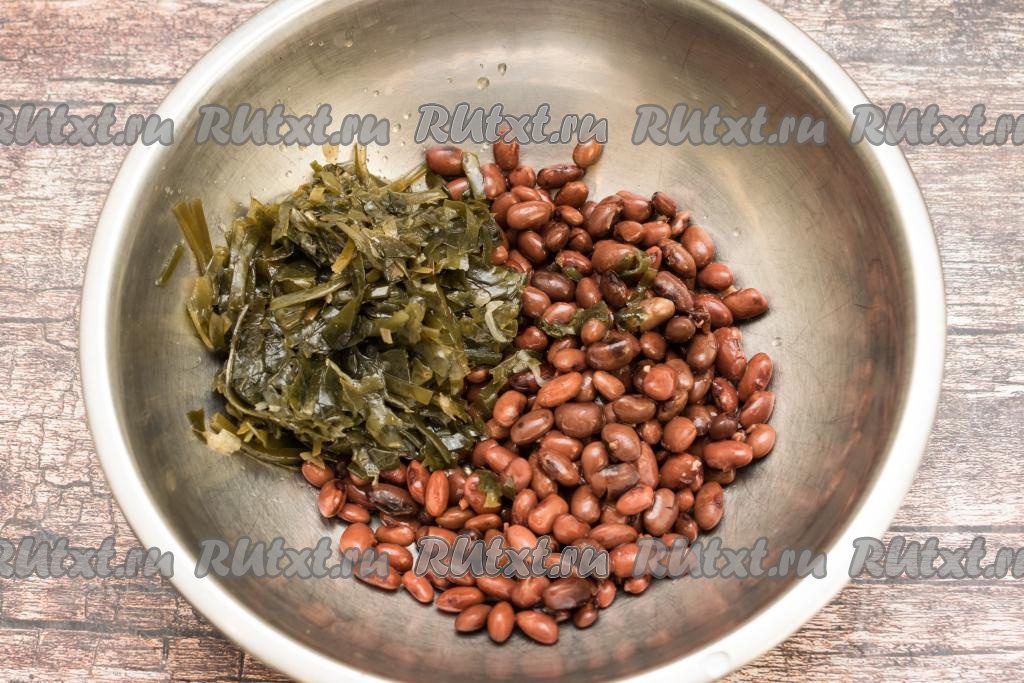 Морскую капусту и консервированную фасоль выложить в глубокую миску.