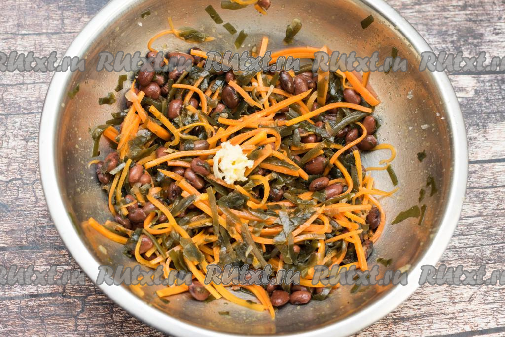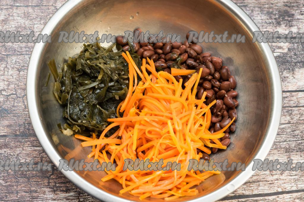 Пока морковка обжаривается, с консервированной фасоли слить жидкость. Откинуть фасоль на сито, промыть под проточной водой, лишней воде дать стечь. Слить лишнюю жидкость из банки с морской капустой.