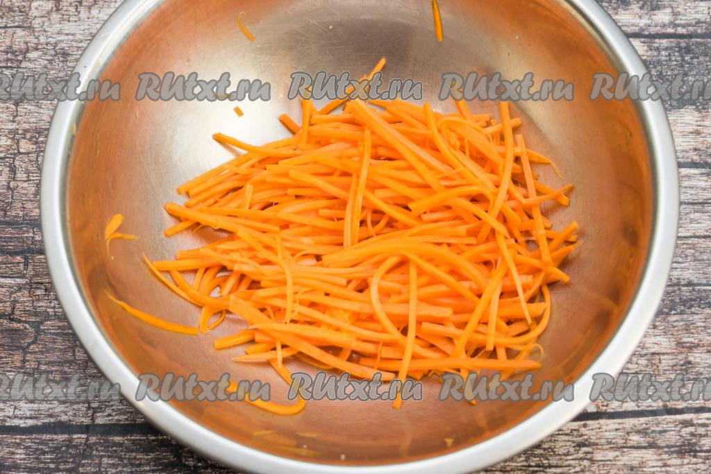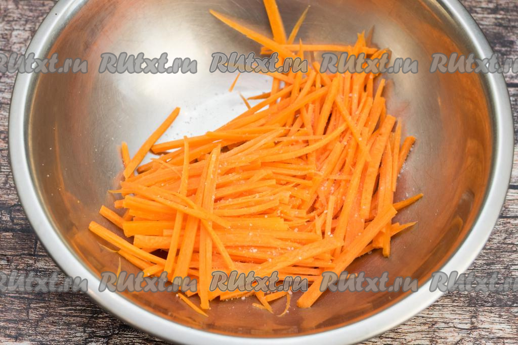 Морковь очистить, натереть на тёрке для корейской морковки, присолить. Я добавила примерно 0,5 чайной ложки соли.