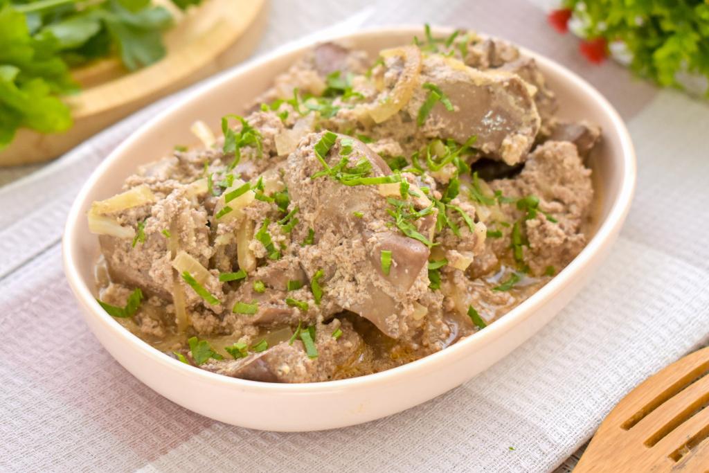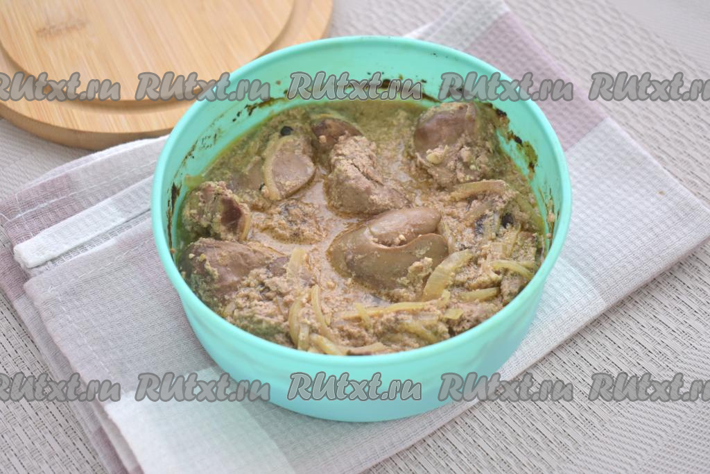 Форму с куриной печенью и луком отправляем в духовку, прогревшуюся до 180 градусов. Запекаем печёнку 30 минут. В процессе запекания каждые 10 минут печень в сметане нужно перемешивать, чтобы она не пересушилась, а равномерно пропиталась соусом, образовавшимся в процессе приготовления.