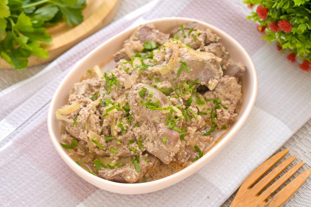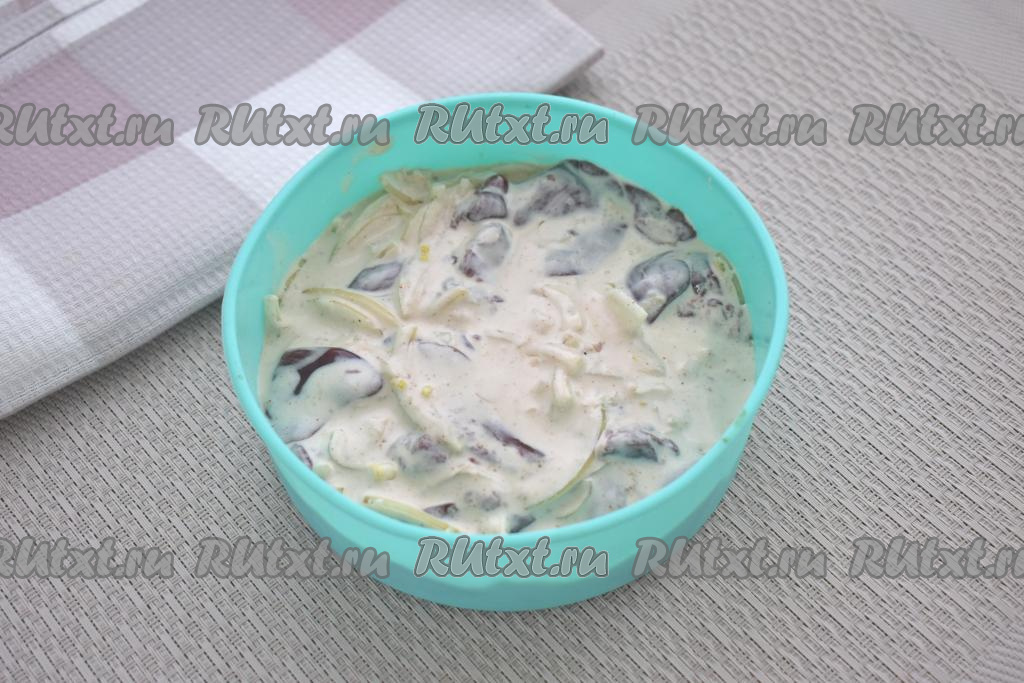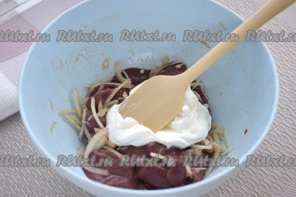 Добавляем к куриной печени сметану любой жирности (я использовала жирностью 20%).