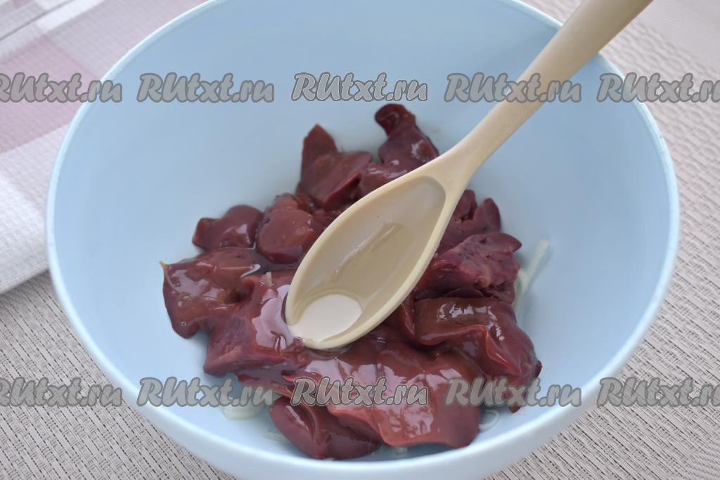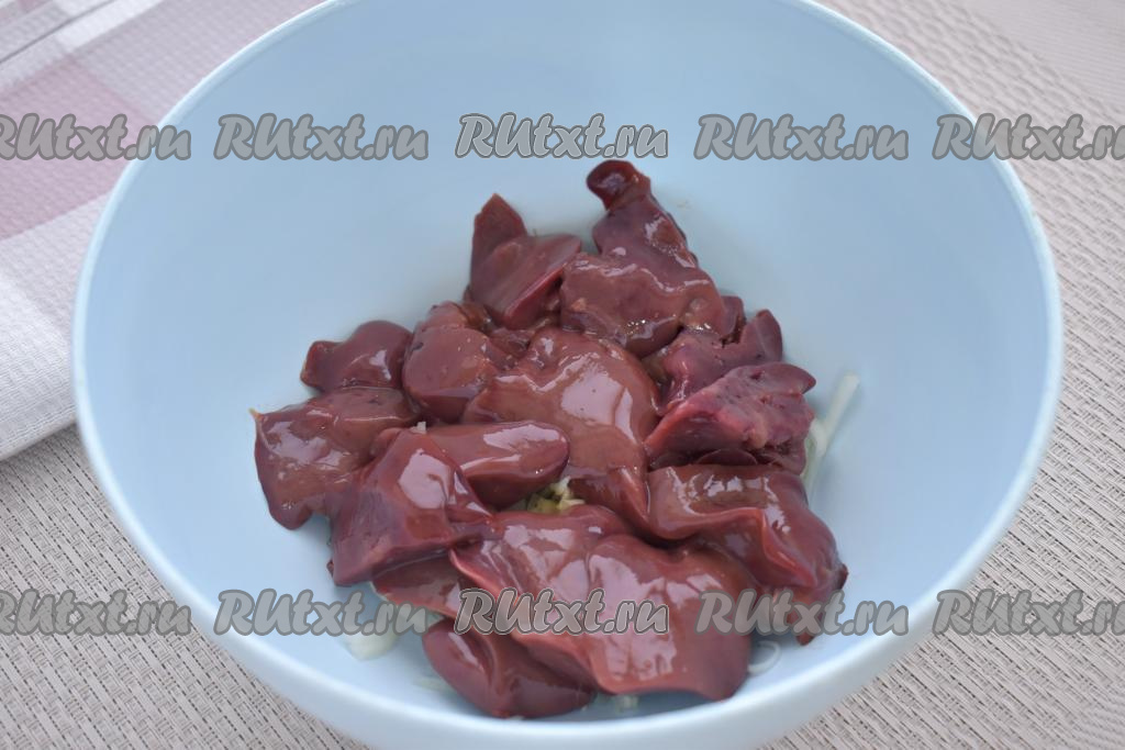 Куриную печень моем, отрезаем плёночки и прожилки, нарезаем на средние кусочки, перекладываем в миску с луком и чесноком.