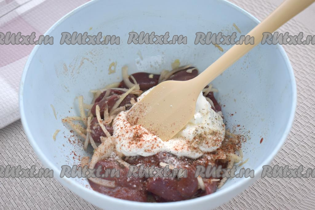 Сразу же всыпаем соль и специи (в качестве специй я решила добавить чёрный молотый перец и паприку), вливаем 50 миллилитров воды комнатной температуры. Хорошо перемешиваем, покрывая куриную печень сметаной и специями со всех сторон.