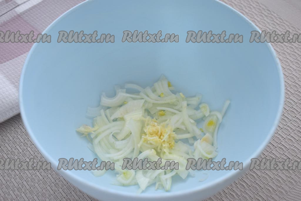 Включаем сразу духовку и выставляем температуру на 180 градусов. Очищаем лук и чеснок. Лук нарезаем на тонкие полукольца (или четверть кольца), выкладываем в миску, добавляем пропущенный через пресс чеснок.
