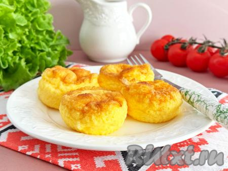 Силиконовые формочки с готовым омлетом достать из аэрогриля. Дать немного остыть, омлет немного опадёт, но на вкусе это не скажется. А затем достать из формочек, переложить на тарелку. Нежный, аппетитный, вкусный омлет в тёплом виде подать к столу.