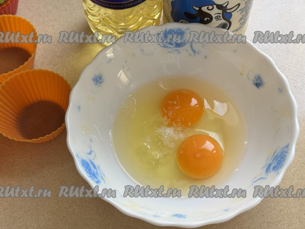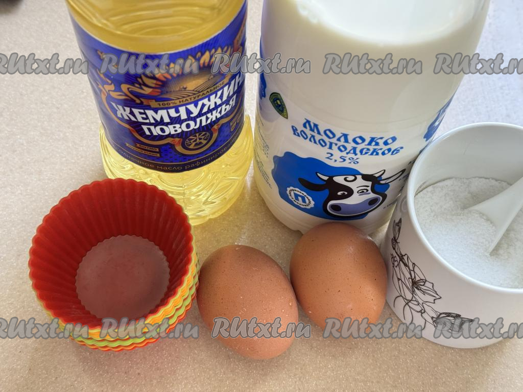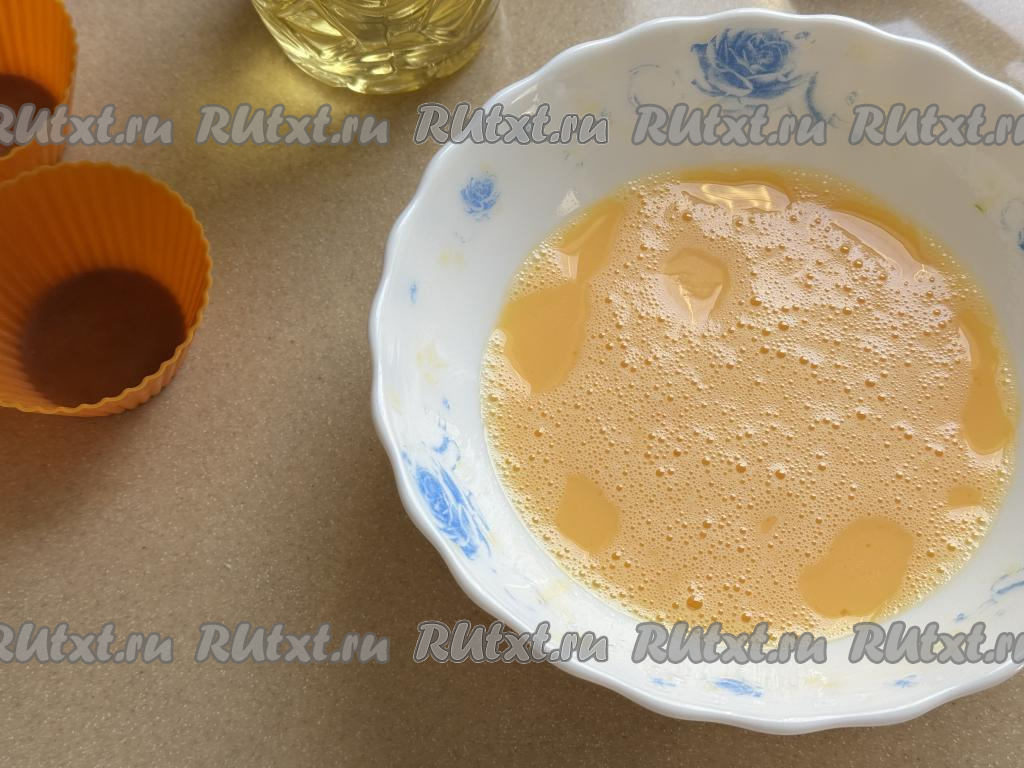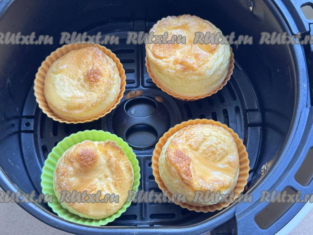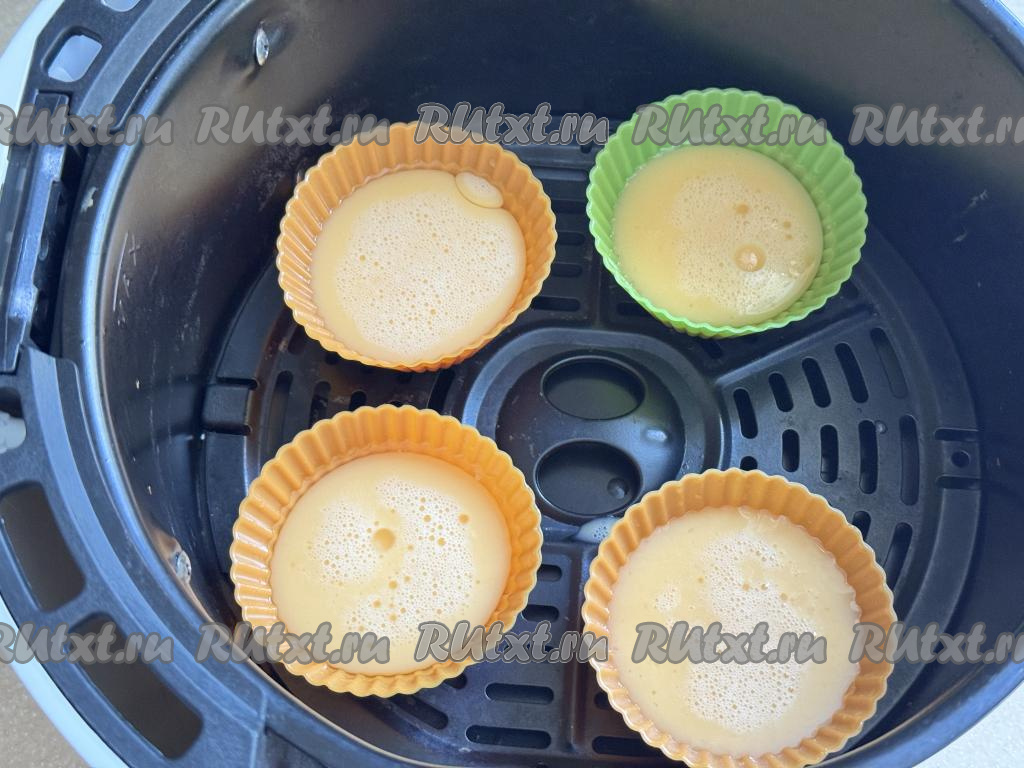 Немного смазать силиконовые формочки растительным маслом. Разлить яично-молочную массу по силиконовым формочкам, заполняя формы не более, чем до половины. Я разлила по 4 формочкам. Установить формочки на решётку аэрогриля.