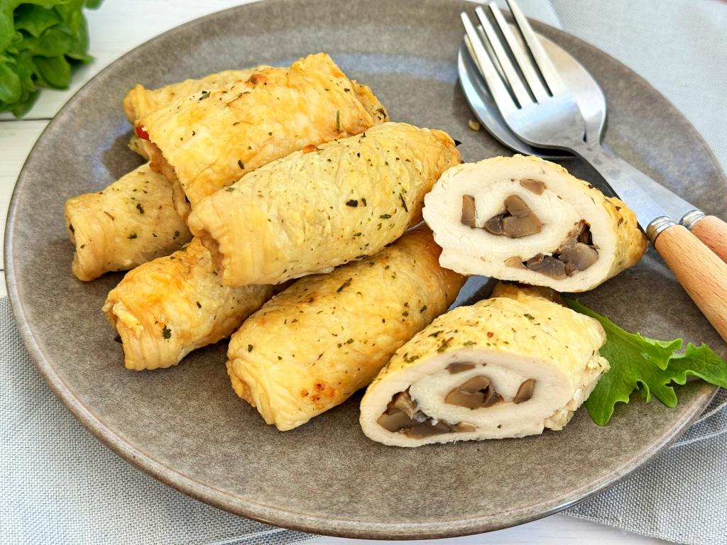 Нежные, аппетитные куриные рулетики с сочной начинкой из грибов достать из аэрогриля и в горячем виде подать к столу, дополнив любимым гарниром.