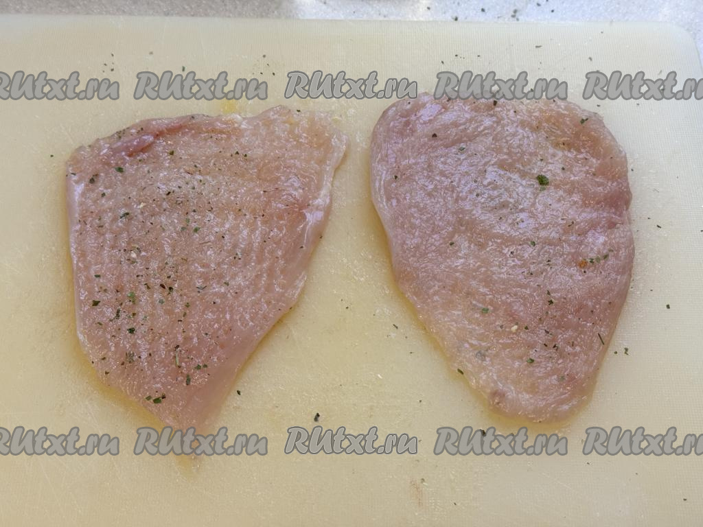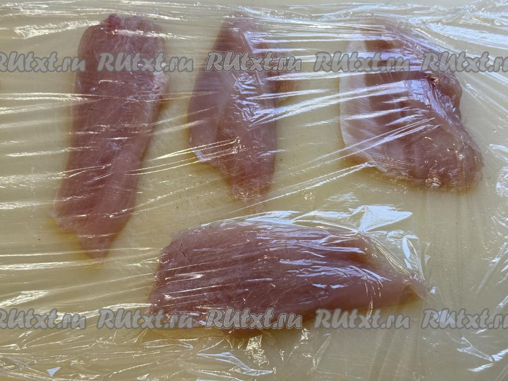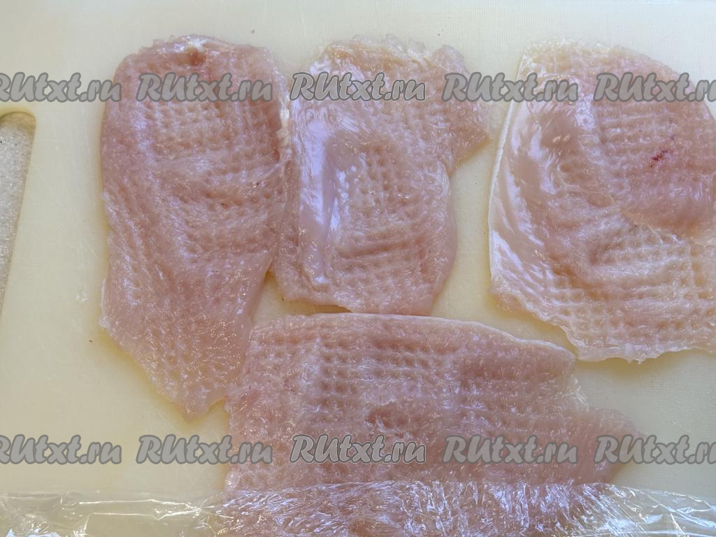 Куриное филе нарезать на плоские кусочки толщиной 1,5 сантиметра. У меня получились 7 кусочков из двух филе. Выложить кусочки филе на разделочную доску, накрыть пищевой плёнкой.