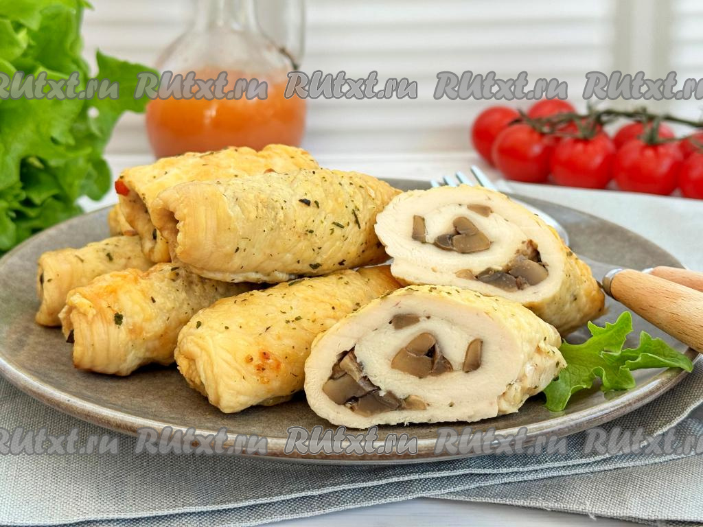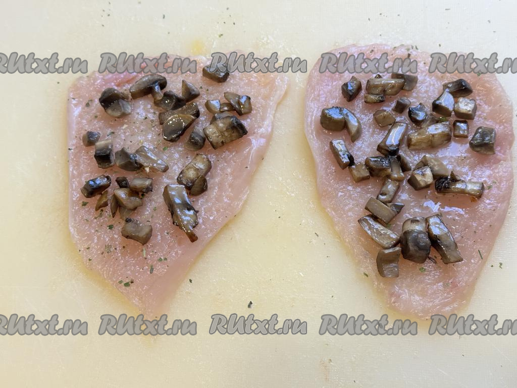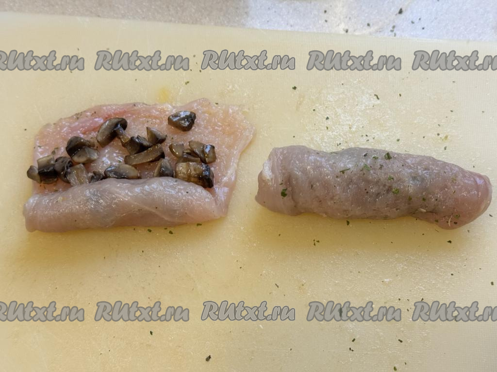 Завернуть каждую отбивную из куриного филе с грибами в плотный рулетик.