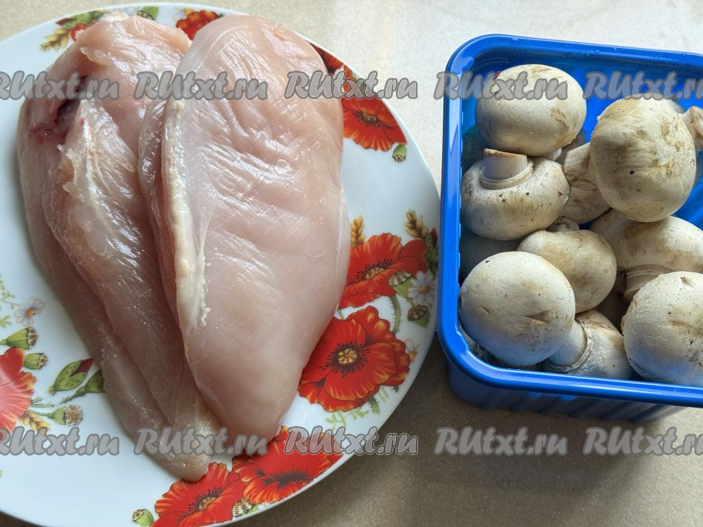 Подготовить продукты. В качестве грибов можно взять шампиньоны, вешенки или лесные грибы. Грибы нужно будут промыть водой. Лесные грибы нужно будет предварительно отварить в течение 25-30 минут с момента закипания воды, затем откинуть на дуршлаг, чтобы стекла вода. Я взяла шампиньоны. Куриное филе промыть водой, обсушить.