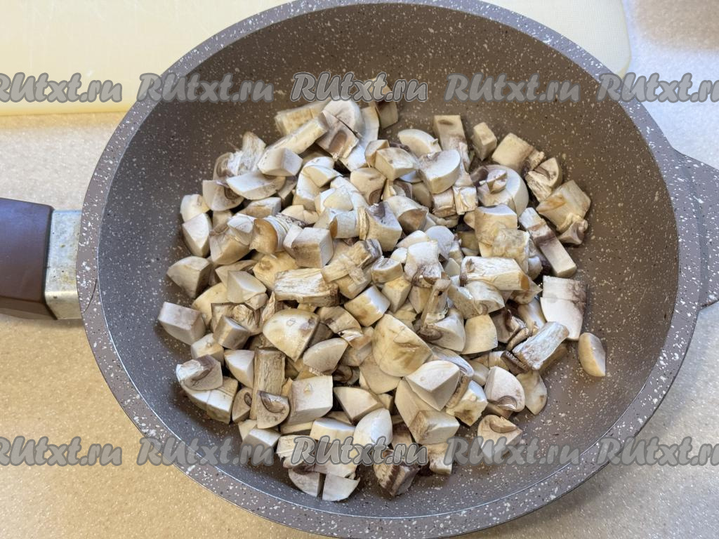 Шампиньоны, или вешенки, или предварительно отваренные лесные грибы нарезать на средние кусочки, выложить в сковороду, в которой уже хорошо прогрелось растительное масло.