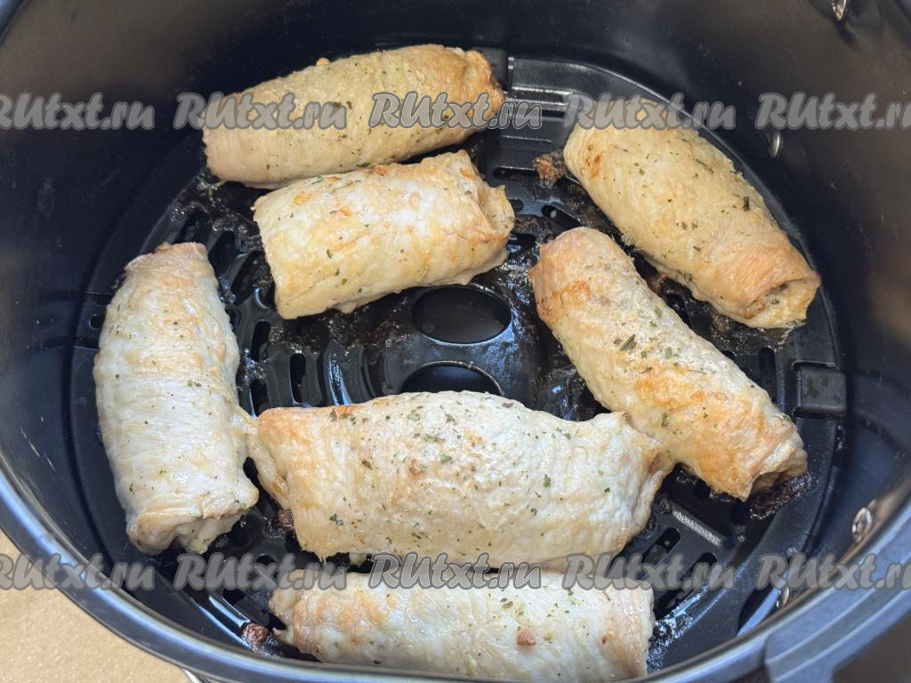 Выставить температуру 170 градусов, время - 15 минут. По окончании времени установить температуру на 180 градусов и подрумянить рулетики в аэрогриле в течение 5 минут.